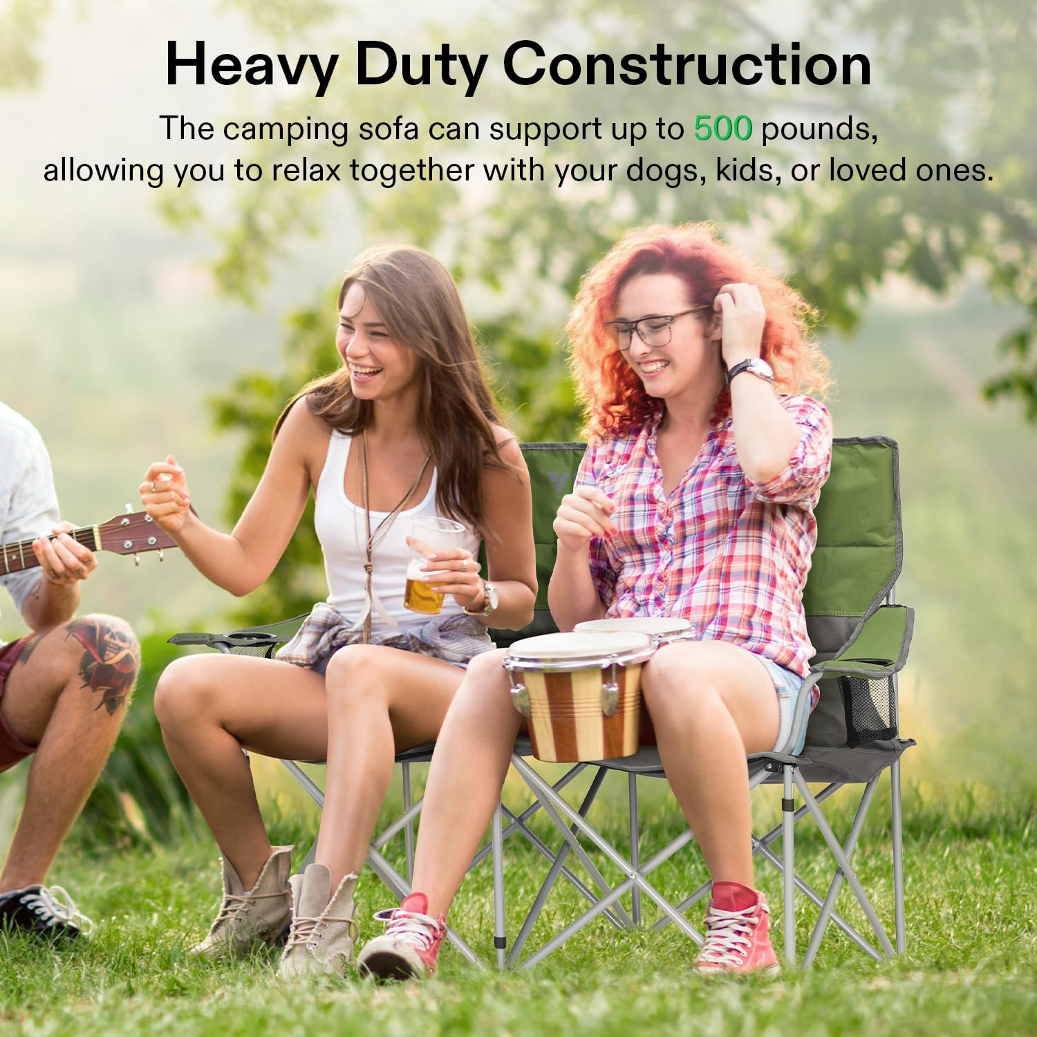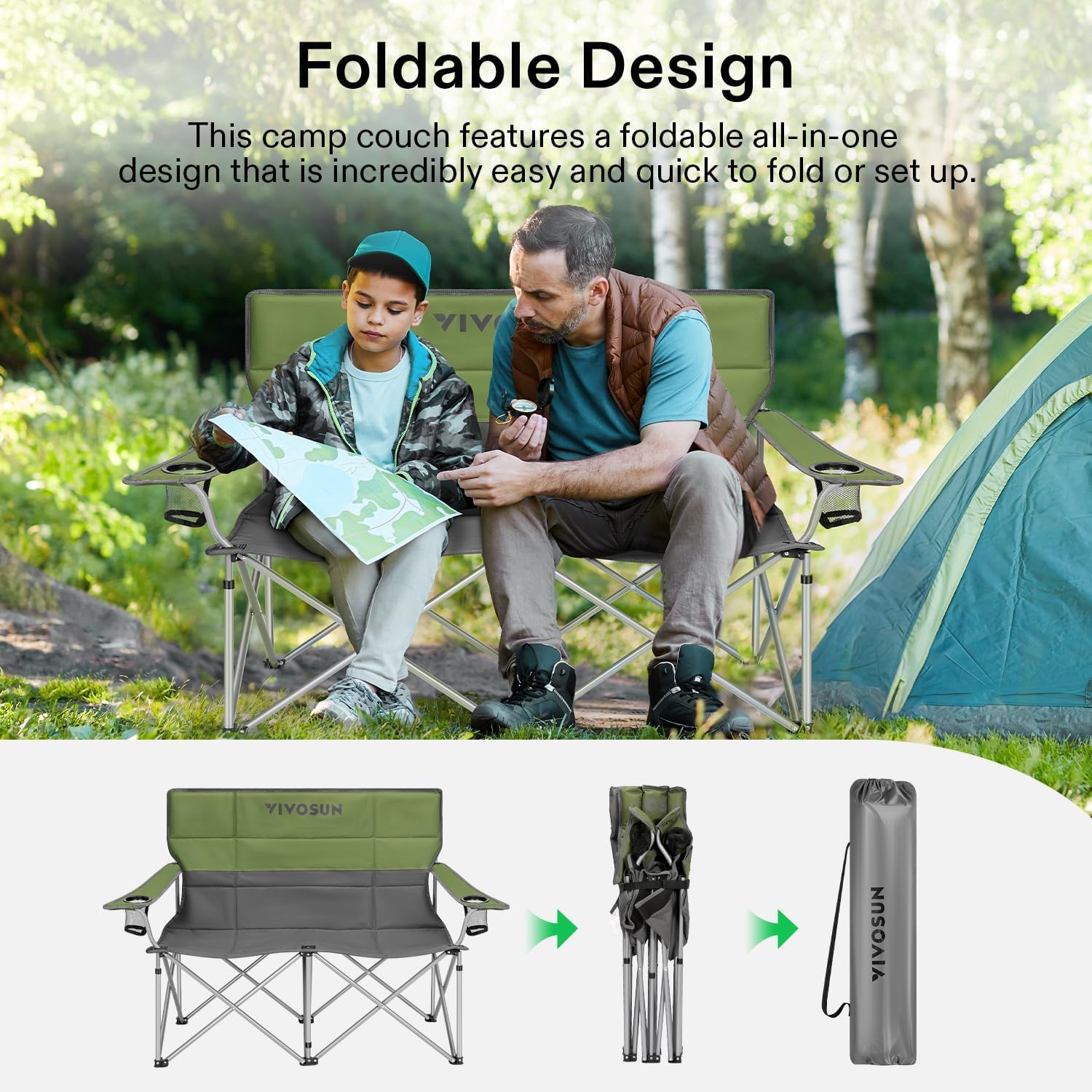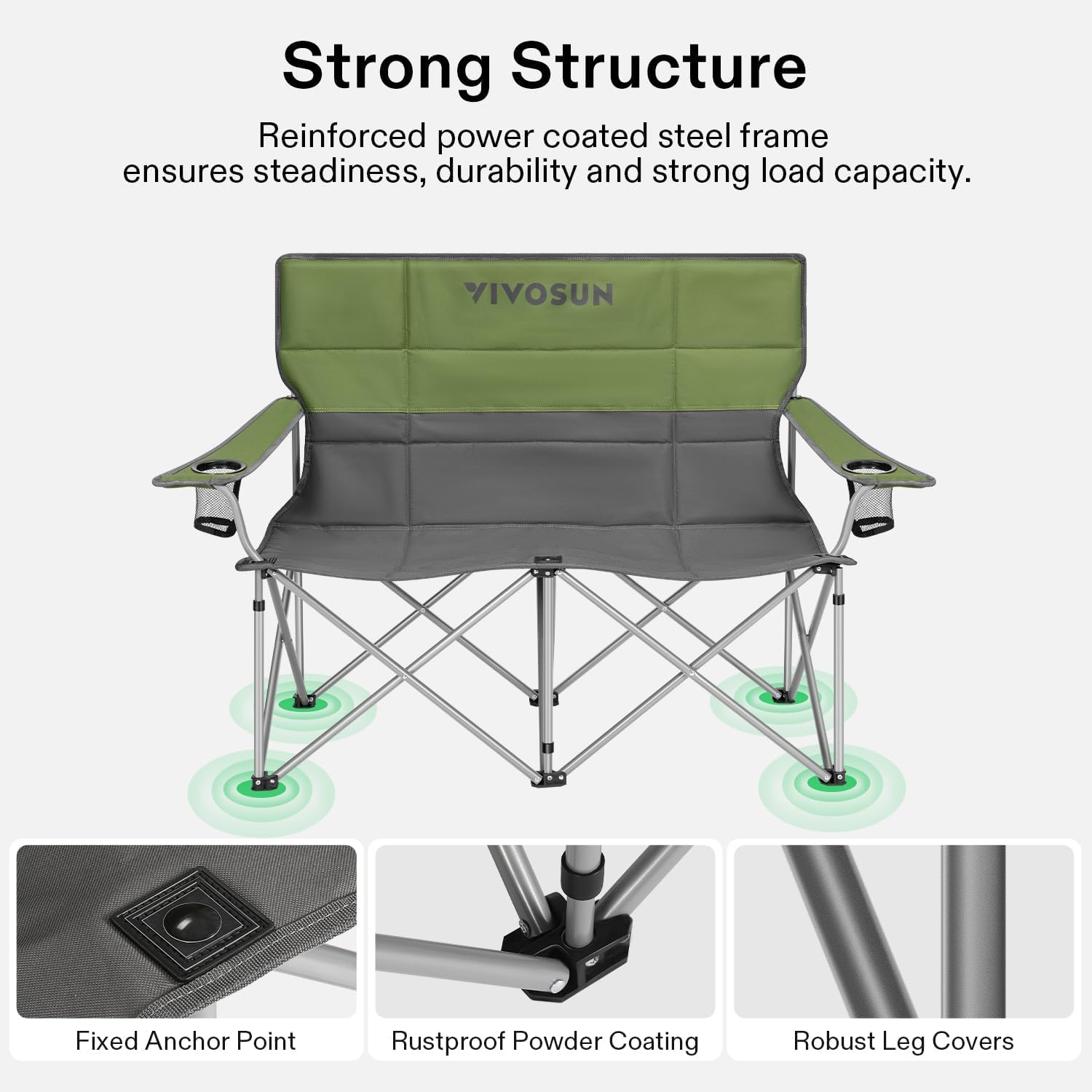 VIVOSUN Double Camping Chair, Fully Padded Folding Loveseat, Portable Oversized Duo Chair with Storage Cup Holders, Height-Adjustable Armrests & Carry Bag, Supports up to 500lbs, Green & Grey